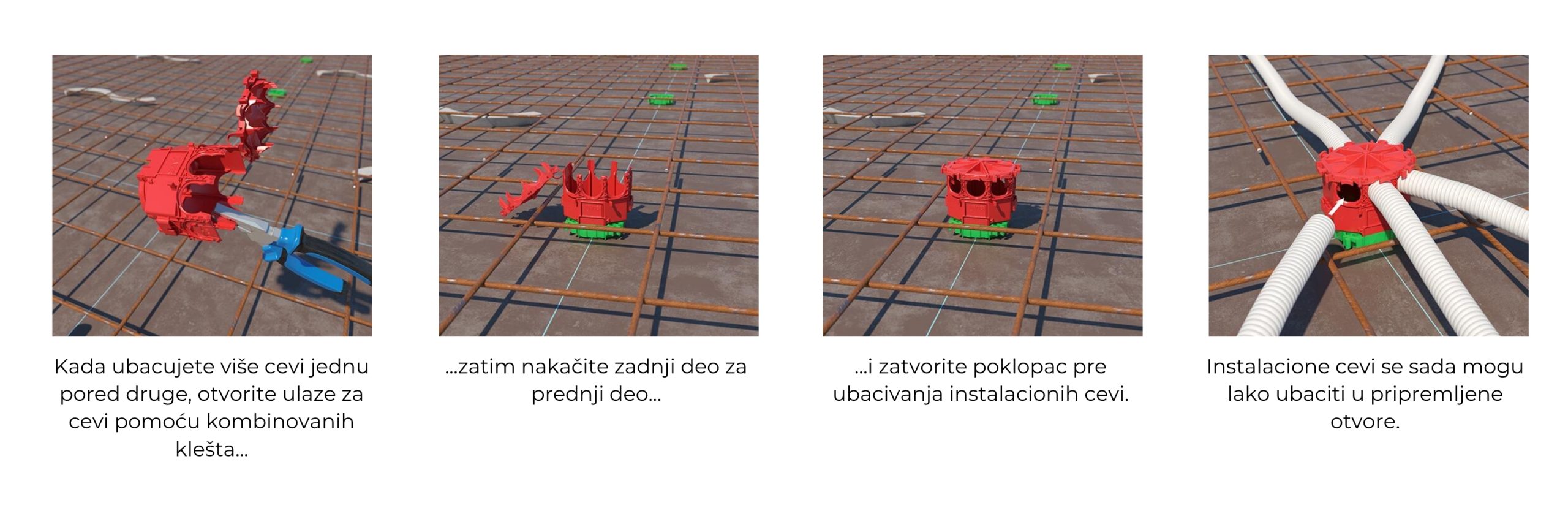 Tokom ugradnje, sve kutije i kućišta povezuju se instalacionim cevima koje služe za kasnije provlačenje instalacionih kablova. Kada se svi elementi povežu, dobijamo zatvoren i zaštićen sistem koji je potpuno zaptiven. Otvori za povezivanje izrađuju se jednostavno – bez alata ili pomoću specijalizovanih KAISER alata – što sprečava prodor betona ili nečistoća u unutrašnjost kutija i cevi, i obezbeđuje maksimalnu pouzdanost i dugotrajnost.