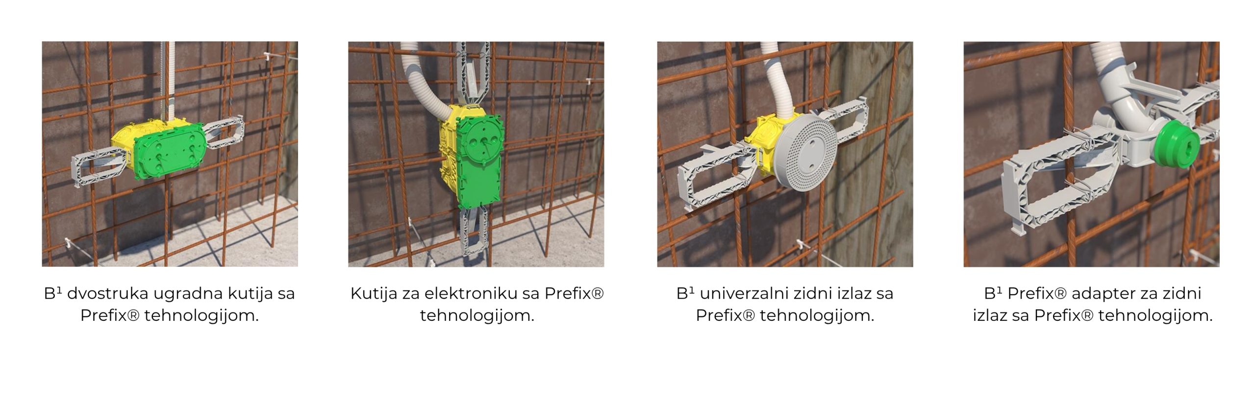 Asortiman B1 kutija uz primenu Prefix® krila lako se montira na armaturnu mrežu kod vertikalnih betonskih zidova. Za ovu grupu proizvoda refix® krila se dodatno poručuju. Ovo omogućava postavljanje kutija u zahtevanu poziciju bez potrebe njihovog njihovog zakucavanja (fiksiranja) za oplatu.