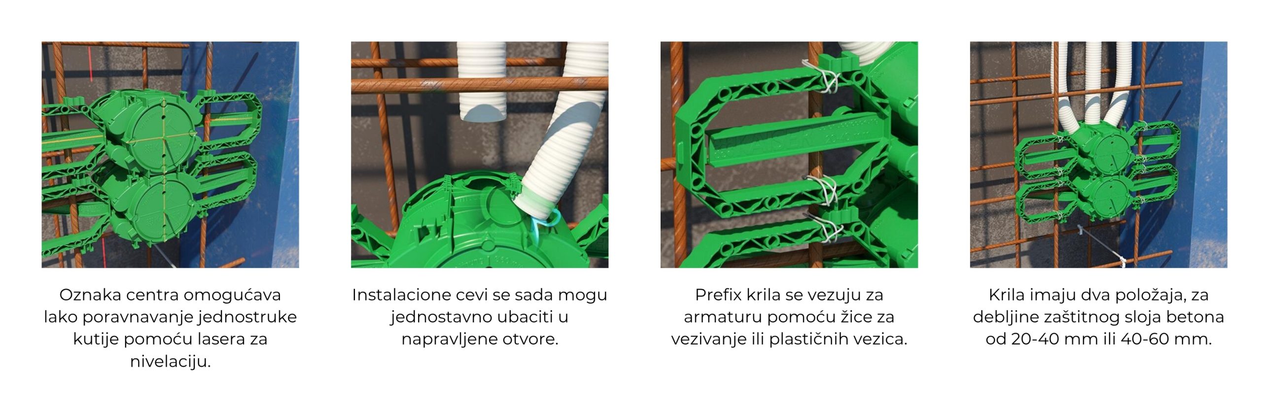 KAISER komponente su izrađene od plastike koja je otporna na vlagu, pritisak i mehanička oštećenja. Po završetku betoniranja, svi elementi ostaju dostupni, funkcionalni i lako spojivi sa ostatkom elektroinstalacija.